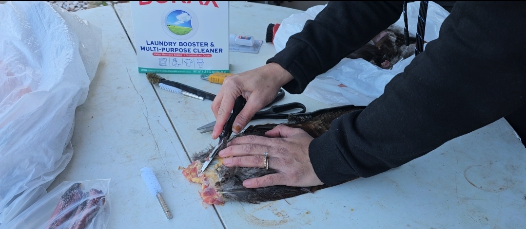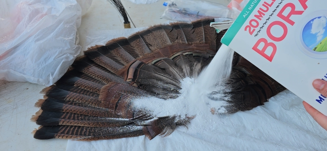Once the feathers are clean, apply a generous amount of Borax to all the exposed flesh areas. Ensure that the Borax coats the feathers and skin well to aid in drying and preservation. The Borax helps to kill mites and dry out any remaining flesh.