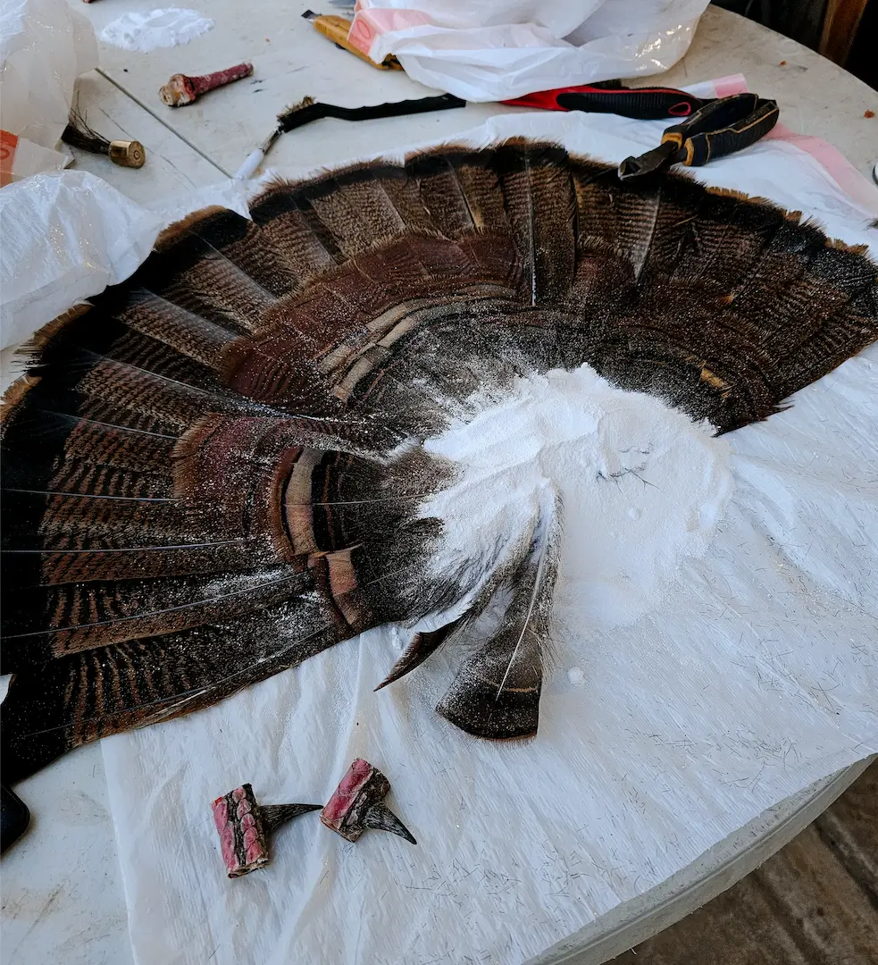 If you do not want to use a quick-set method, you can dry out the turkey fan. This process takes about two months, depending on how well you clean the meat and flesh. Thoroughly drying the turkey tail is a critical step in the taxidermy process to prevent decay and ensure the longevity of the mount. Moisture trapped within the feathers or skin can lead to bacterial growth and deterioration over time, compromising the integrity of the mount. Not to mention the smell! Therefore, it’s essential to properly clean and use the correct drying techniques.