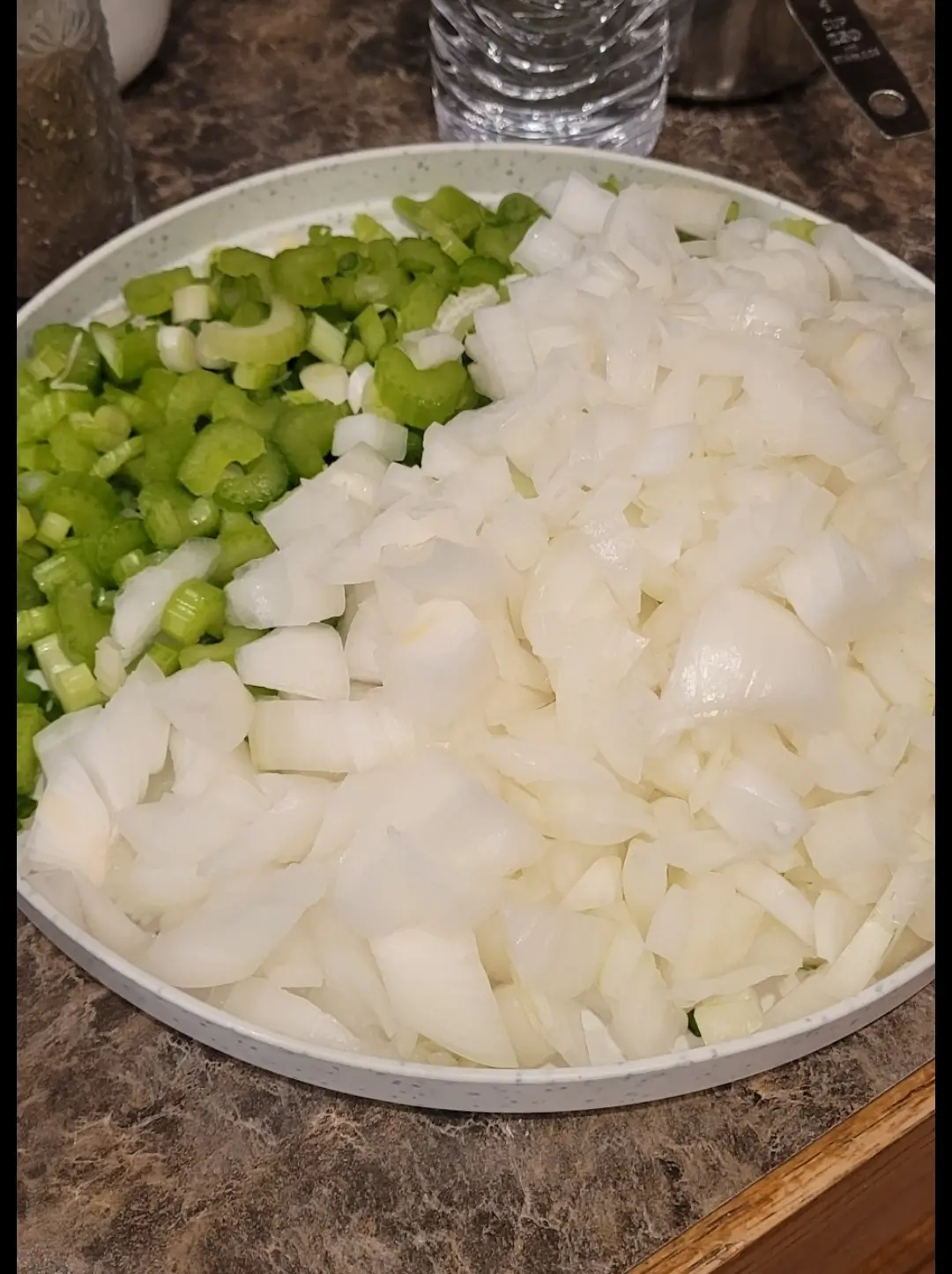 Step 4: Stir in vegetables: Onion, garlic, celery. Add broth fill half the pot and boil. Skim any excess fat that boils to the top.