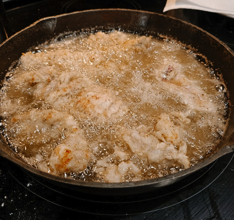 Step 5: I heat a cast iron skillet and olive oil until hot. You can test by sprinkling in a few drops of flour.