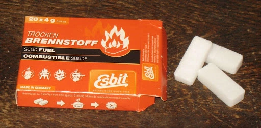 Trioxane bars, developed for military rations, are blue-tinted, snap-apart fuel bars designed to heat meals or start fires. Both fit into compact stoves or can burn on a flat surface, delivering heat without the complexity of dealing with liquid fuel systems.