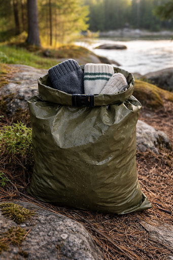 For boots, crumple dry socks, a bandana, or even toilet paper inside to absorb moisture. Place boots near the foot of your bag (not inside if they’re muddy) or in the vestibule if it’s sheltered. In the morning, swap the absorbent material again. A vapor barrier trick helps: wear a thin plastic bag (trash compactor liner or grocery bag) over your feet with dry socks on top-this traps heat close and speeds evaporation without soaking the bag.