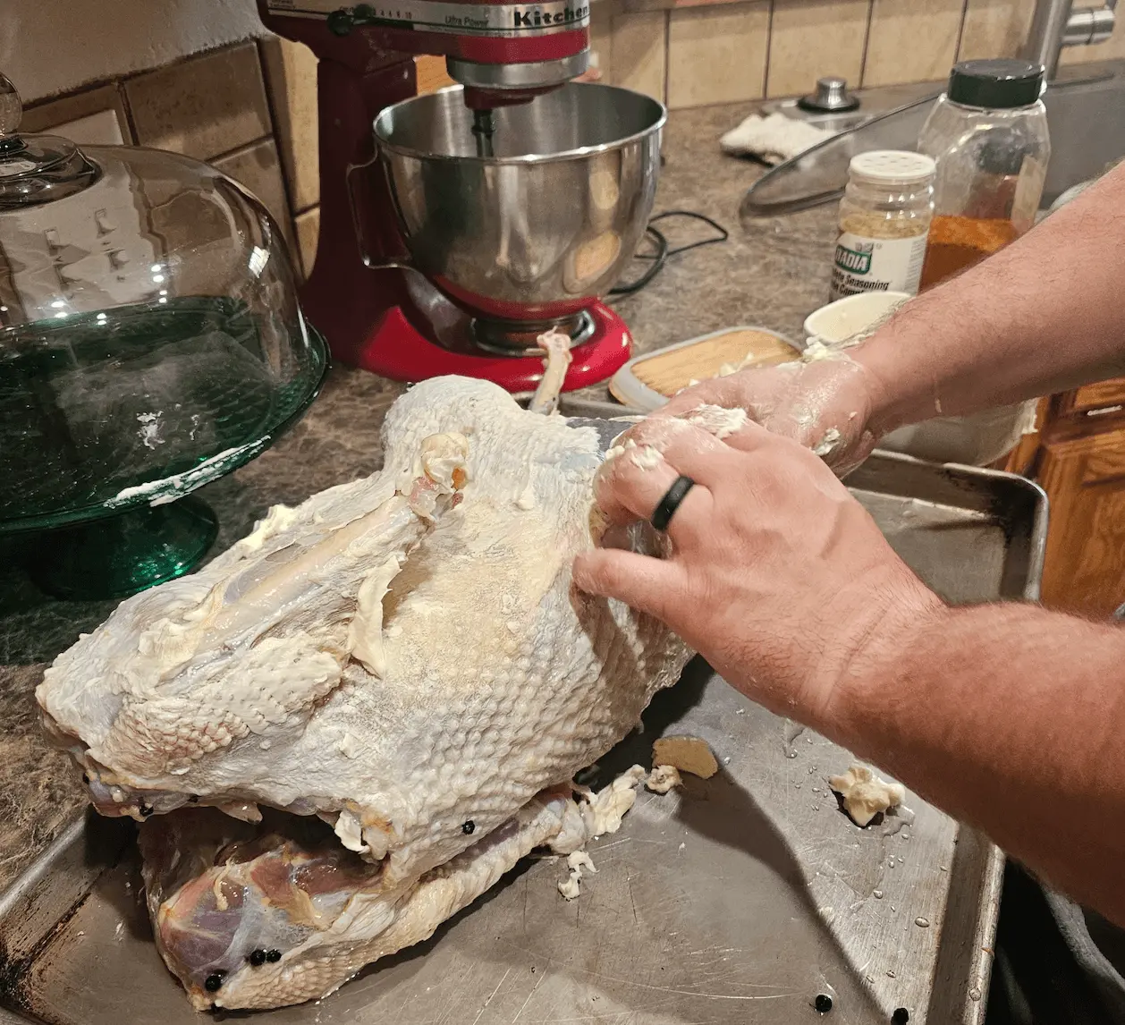 - Use your hands to separate the skin from the meat. Stuff butter in between the skin and meat. (Breast and Thighs)