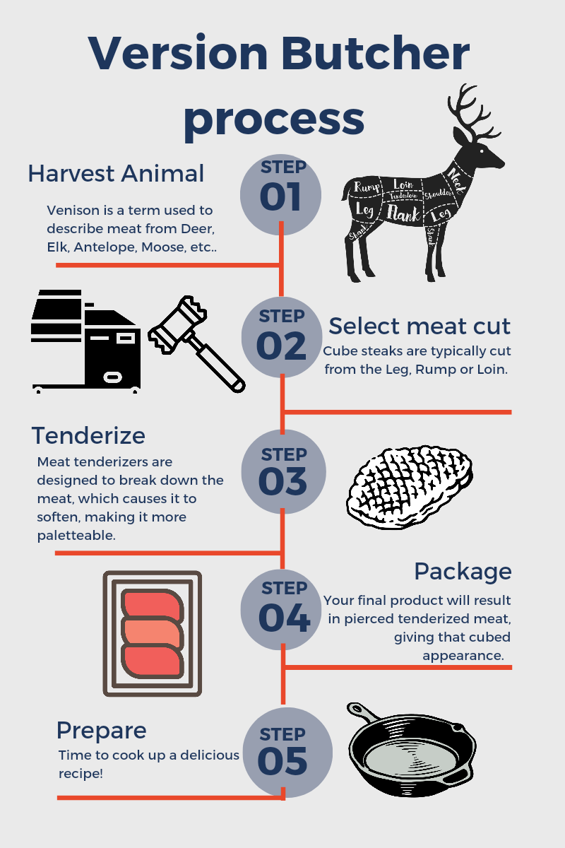 The butchering process of creating cube steak is all about transforming tougher cuts into tender, flavorful steaks that are both versatile and delicious. Here is a chart that shows the Venison process.