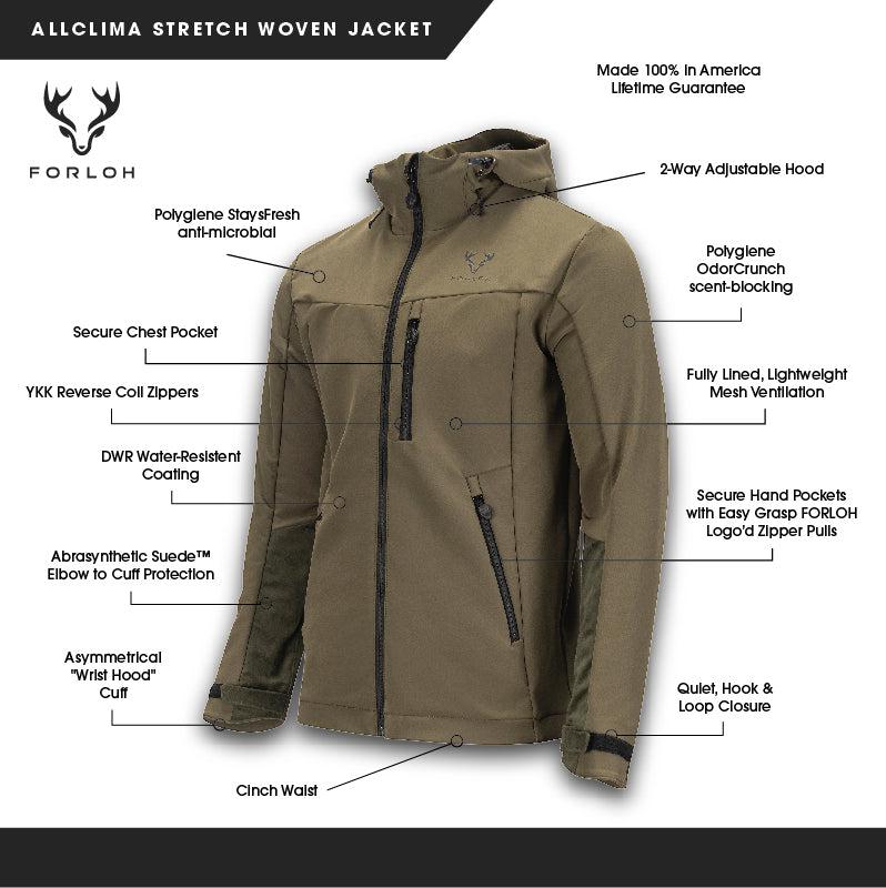 <h2> <span style="font-weight: 400;">Your</span><span style="font-weight: 400;"> New All Weather Jacket</span><br> </h2> <div class="RichText3-paragraph--withVSpacingNormal RichText3-paragraph Typography Typography--m">This men's all weather jacket is designed to keep you comfortable in any weather, on any terrain, any season. <span data-mce-fragment="1">Part of FORLOH’s multi-award winning AllClima™ range, this mid-weight jacket offers 4-way stretch and </span>full mesh lining.</div> <div class="RichText3-paragraph--withVSpacingNormal RichText3-paragraph Typography Typography--m"></div> <div class="RichText3-paragraph--withVSpacingNormal RichText3-paragraph Typography Typography--m"></div> <div class="RichText3-paragraph--withVSpacingNormal RichText3-paragraph Typography Typography--m"></div> <div class="RichText3-paragraph--withVSpacingNormal RichText3-paragraph Typography Typography--m"></div> <div class="RichText3-paragraph--withVSpacingNormal RichText3-paragraph Typography Typography--m">The perfect companion to our best-selling <span style="text-decoration: underline;"><a title="Men's AllClima Stretch Woven Pant" href="https://forloh.com/products/mens-allclima-hunting-stretch-woven-pant">AllClima Stretch Woven Twill Pant</a></span>, this multi-season all-weather duo has you covered. <br><br> </div> <div class="RichText3-paragraph--withVSpacingNormal RichText3-paragraph Typography Typography--m"></div> <div class="RichText3-paragraph--withVSpacingNormal RichText3-paragraph Typography Typography--m"></div> <h3 class="RichText3-paragraph--withVSpacingNormal RichText3-paragraph Typography Typography--m">Breathable &amp; Weather Resistant</h3> <div class="RichText3-paragraph--withVSpacingNormal RichText3-paragraph Typography Typography--m">Warm yet highly breathable, the interior of our all weather jacket is fully lined with mesh ventilation. Take on quick scrambles and mountain ascents in the backcountry and stay cool on warmer days when shedding heat is essential.</div> <div class="RichText3-paragraph--withVSpacingNormal RichText3-paragraph Typography Typography--m">Our no-rattle zipper system features YKK reverse coil zippers with garages. Cinch cords on both the waist and hood let you fine-tune fit and easily layer with mid layers, base layers, hats, or helmets. Two zippered hand pockets and a zippered chest pocket keep all your essentials safe and secure. <br><br> </div> <div class="RichText3-paragraph--withVSpacingNormal RichText3-paragraph Typography Typography--m"></div> <div class="RichText3-paragraph--withVSpacingNormal RichText3-paragraph Typography Typography--m"></div> <div class="RichText3-paragraph--withVSpacingNormal RichText3-paragraph Typography Typography--m"></div> <div class="RichText3-paragraph--withVSpacingNormal RichText3-paragraph Typography Typography--m"></div> <h3 class="RichText3-paragraph--withVSpacingNormal RichText3-paragraph Typography Typography--m">Superior Abrasion Resistance</h3> <div class="RichText3-paragraph--withVSpacingNormal RichText3-paragraph Typography Typography--m">Featuring engineered design and purposeful articulation built for comfort and mobility, we reinforce the fabric with our durable synthetic suede elbow-to-forearm-to-cuff to stand up to the harshest of scoping spots and the sharpest of rocks. DWR-treated and water-resistant, FORLOH Abrasynthetic Suede<span>™</span> has been abrasion tested at over 150,000+ cycles (Martindale Test) to keep your elbows and forearms protected. Uniquely printed to match <span style="text-decoration: underline;"><a title="FORLOH Camo" href="https://forloh.com/pages/our-camo">our camo</a></span> and solid colors, you'll stay visually concealed while hunting. <br><br> </div> <div class="RichText3-paragraph--withVSpacingNormal RichText3-paragraph Typography Typography--m"> <meta charset="UTF-8"> <h3><strong>Built-In Odor Protection</strong></h3> <p><span style="font-weight: 400;">Built-in Polygiene® Stay Fresh antimicrobial and Odor Crunch® scent control systems keep you fresher and less detectable to prey and humans alike. This is the ultimate all weather jacket for your outdoor adventures.</span></p> </div> <div class="RichText3-paragraph--withVSpacingNormal RichText3-paragraph Typography Typography--m"></div> <h3 class="RichText3-paragraph--withVSpacingNormal RichText3-paragraph Typography Typography--m">Made in America</h3> <div class="RichText3-paragraph--withVSpacingNormal RichText3-paragraph Typography Typography--m"> <meta charset="utf-8">By purchasing this jacket, you are not only investing in a superior outdoor garment but also supporting local communities. It is 100% sourced and made in America, like all FORLOH products, demonstrating our commitment to investing here at home and building our domestic economy. <br> </div> <h4><b>Features</b></h4> <ul> <ul> <li style="font-weight: 400;"><span style="font-weight: 400;"><span>AbraSynthetic Ultra Suede strong and water-resistant elbow-to-forearm-to-cuff protection</span></span></li> <li style="font-weight: 400;"><span style="font-weight: 400;"><span>Built-in <a href="https://forloh.com/pages/polygiene-stay-fresh" title="Polygiene - Stay Fresh Technology">Polygiene® Stay Fresh antimicrobial</a> and <a href="https://forloh.com/pages/polygiene-odor-crunch" title="Polygiene - Odor Crunch Technology">Odor Crunch® scent control</a> systems</span></span></li> <li style="font-weight: 400;"><span>Durable functional DWR treated, all-way stretch woven twill fabric</span></li> <li style="font-weight: 400;">Quiet, strong, lifetime warranted YKK reverse coil zippers throughout</li> <li style="font-weight: 400;">Fully-lined lightweight interior mesh for ventilation</li> <li style="font-weight: 400;">Purposeful design throughout for engineered mobility</li> <li style="font-weight: 400;">Cinch waist and hood for fine-tuning fit and secured protection from the elements</li> <li style="font-weight: 400;">Unique FORLOH logo’d molded zippe