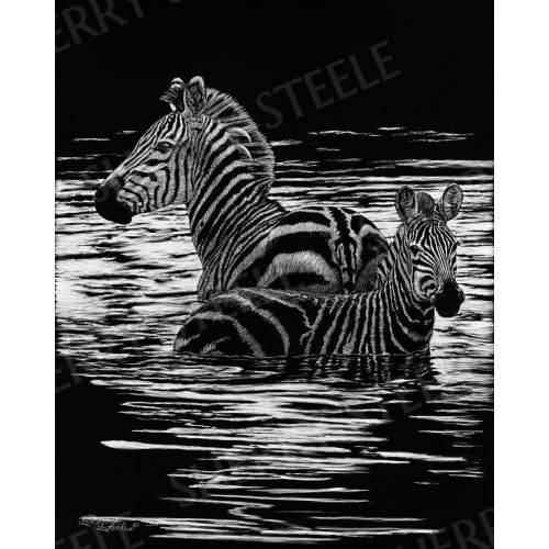 Overpowering thirst has finally broken the deadlock. The unbroken drought lies heavy across the Serengeti as tightly bunched families of Zebra await their chance at the waterhole. Filling the dust-laden air with barks and squeals, each stallion chooses the moment to drive his family forward into the water. Given only a moment to satiate their thirst, each wave of mares and foals surges deeper into the pool in search of untainted water. Reflections of their freshly washed black and white stripes flash as they return to the riverbank. It is a time of confusion for the young and opportunity for the predators. The pure power of Scratchbord captures the tension and the beauty of the moment.